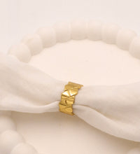 Elevate your hand stack with the Designer Woven Anti-Tarnish Ring. This piece features a striking geometric woven or quilted pattern across the wide band, giving it a high-end designer look and luxurious texture. The golden finish is highly polished, catching the light beautifully for a bold yet sophisticated statement.