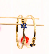 Upgrade your jewellery collection with this elegant pair of gold plated openable bangles, beautifully designed with a stunning blue stone floral charm. The slim engraved band adds a classic touch, while the deep blue stones give a rich and premium look.